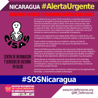#AlertaUrgente NICARAGUA / Gobierno deroga personería jurídica del CISAS