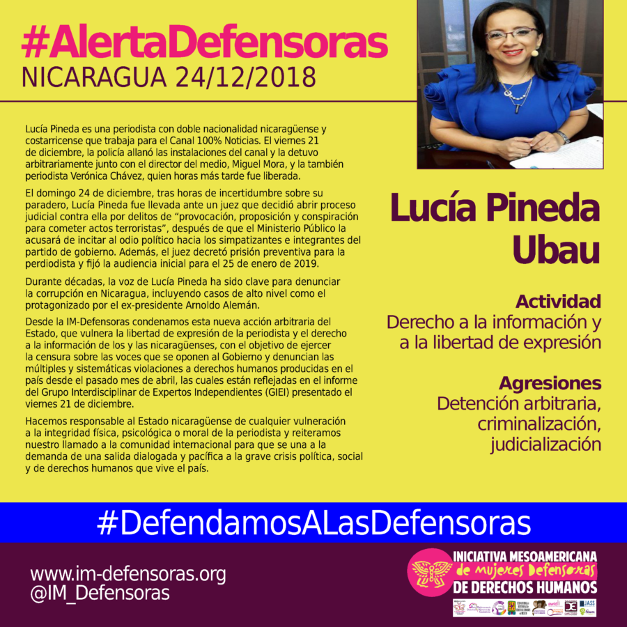 HECHOS - Lucía Pineda es una periodista con doble nacionalidad nicaragüense y costarricense que trabaja para el Canal 100% Noticias. El viernes 21 de diciembre, la policía allanó las instalaciones del canal y la detuvo arbitrariamente junto con el director del medio, Miguel Mora, y la también periodista Verónica Chávez, quien horas más tarde fue liberada.