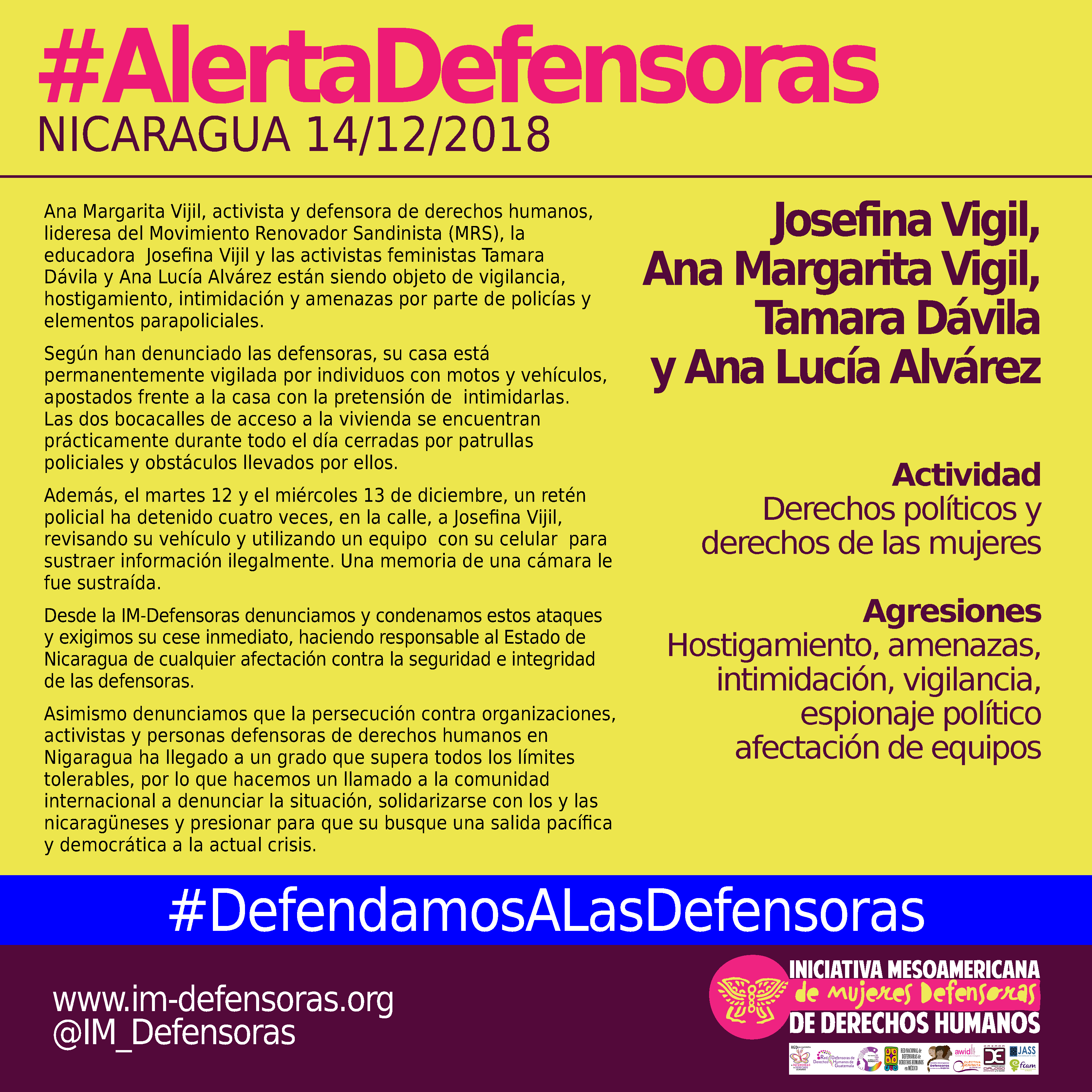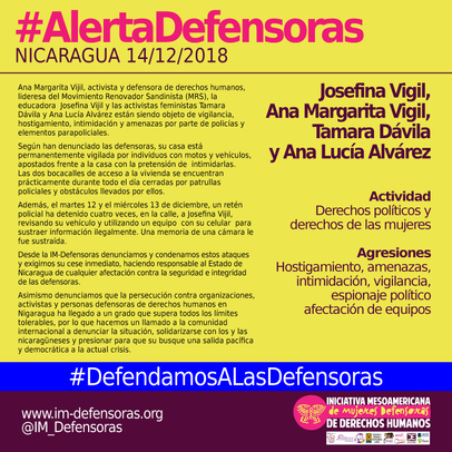 Desde la IM-Defensoras denunciamos y condenamos estos ataques y exigimos su cese inmediato, haciendo responsable al Estado de Nicaragua de cualquier afectación contra la seguridad e integridad de las defensoras.