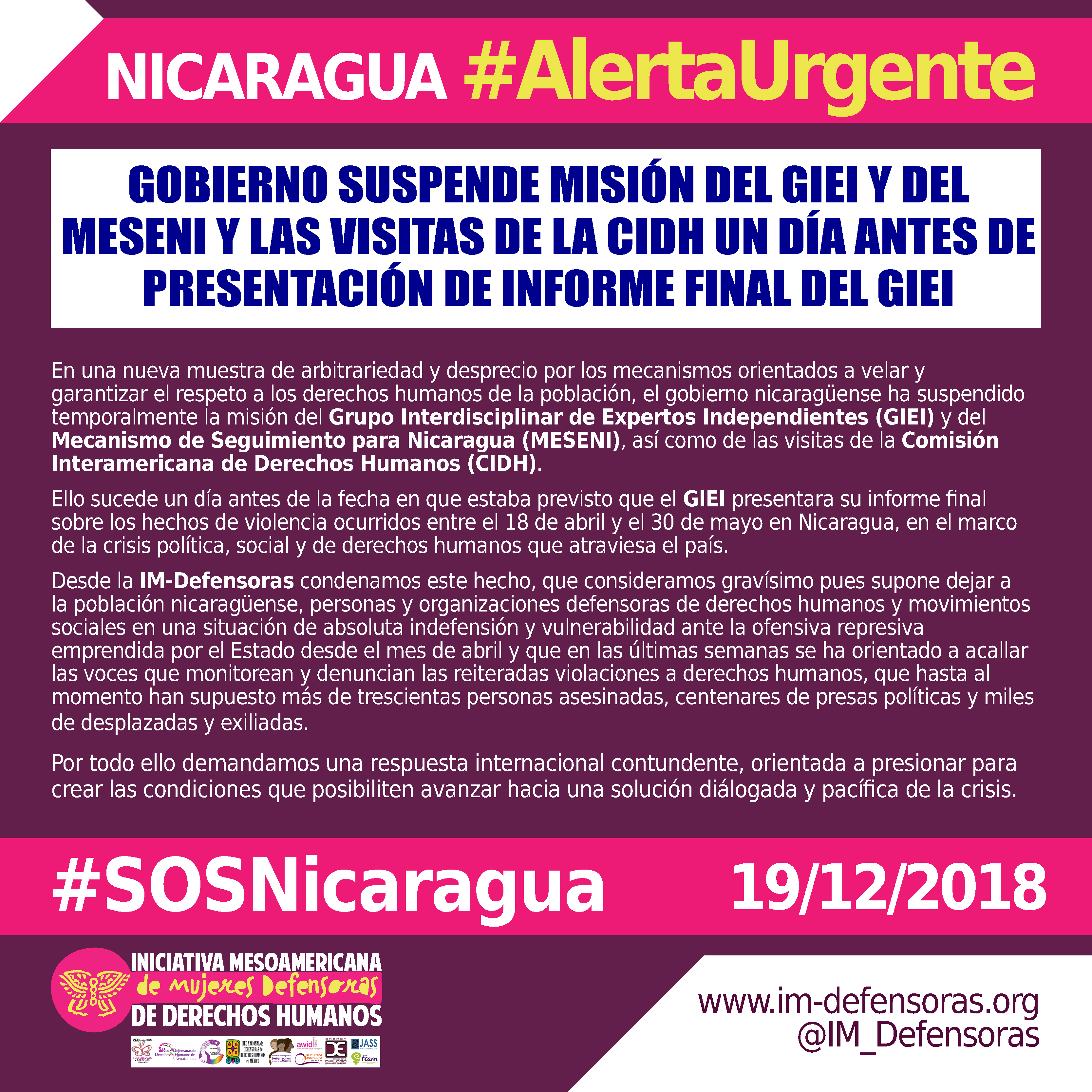 En una nueva muestra de arbitrariedad y desprecio por los mecanismos orientados a velar y garantizar el respeto a los derechos humanos de la población, el gobierno nicaragüense ha suspendido temporalmente la misión del Grupo Interdisciplinar de Expertos Independientes (GIEI) y del Mecanismo de Seguimiento para Nicaragua (MESENI), así como de las visitas de la Comisión Interamericana de Derechos Humanos (CIDH).