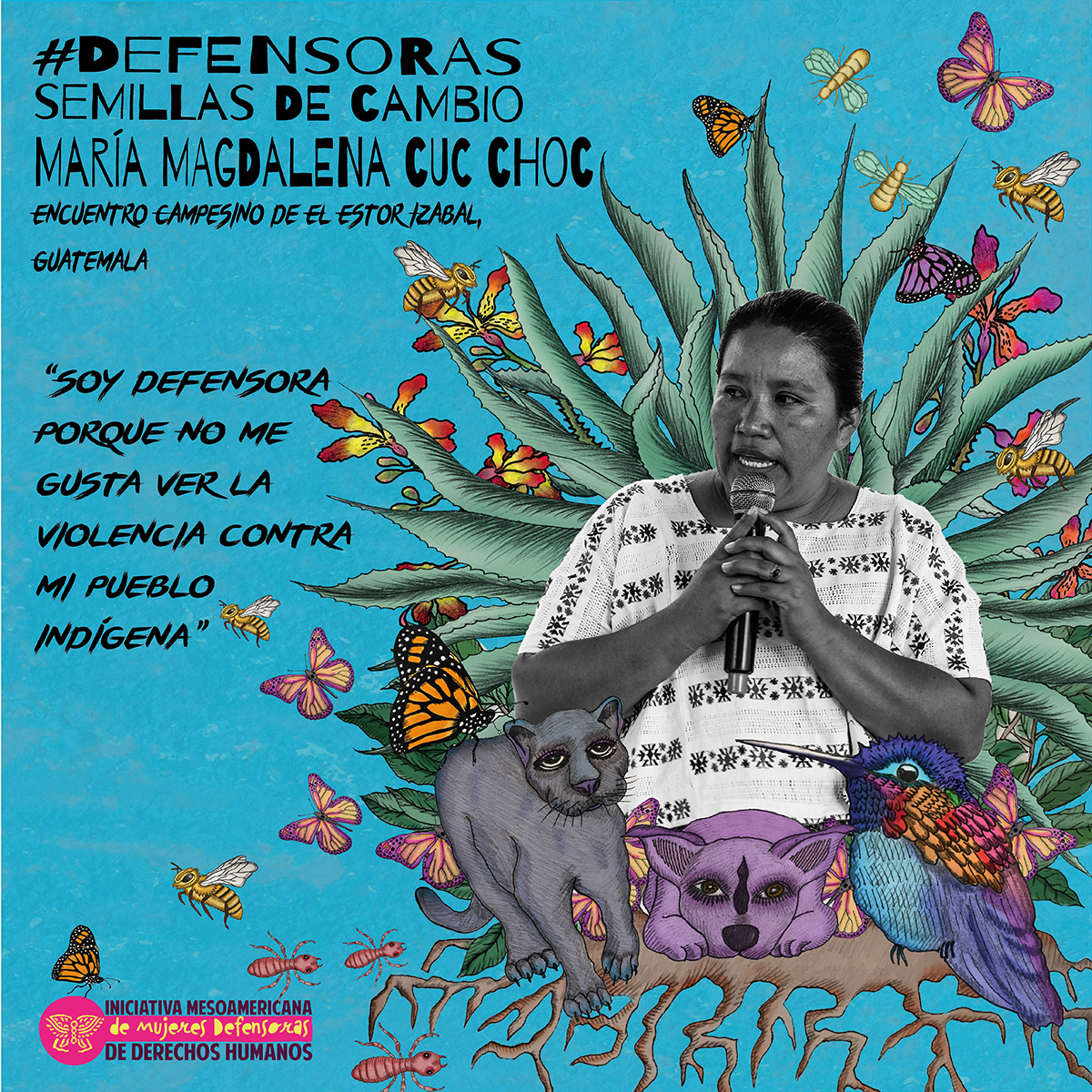 Desde que tenía 13 años María Magdalena Cuc Choc ha defendido los derechos de las mujeres indígenas rurales que no han tenido acceso a sus derechos y viven violencia machista en Guatemala. También defiende los derechos de tierra y territorio desde la cultura Queqchì, apoyando la resistencia de las comunidades que sufren desalojos violentos o acompañando como traductora a comunidades y mujeres sobrevivientes de violencia en procesos de búsqueda de justicia, procesos penales, desalojos y resistencias en contra de compañías mineras y de monocultivo. Su lucha está inspirada por el deseo de que las mujeres gocen de una vida libre de violencia y puedan ejercer su derecho a la participación.