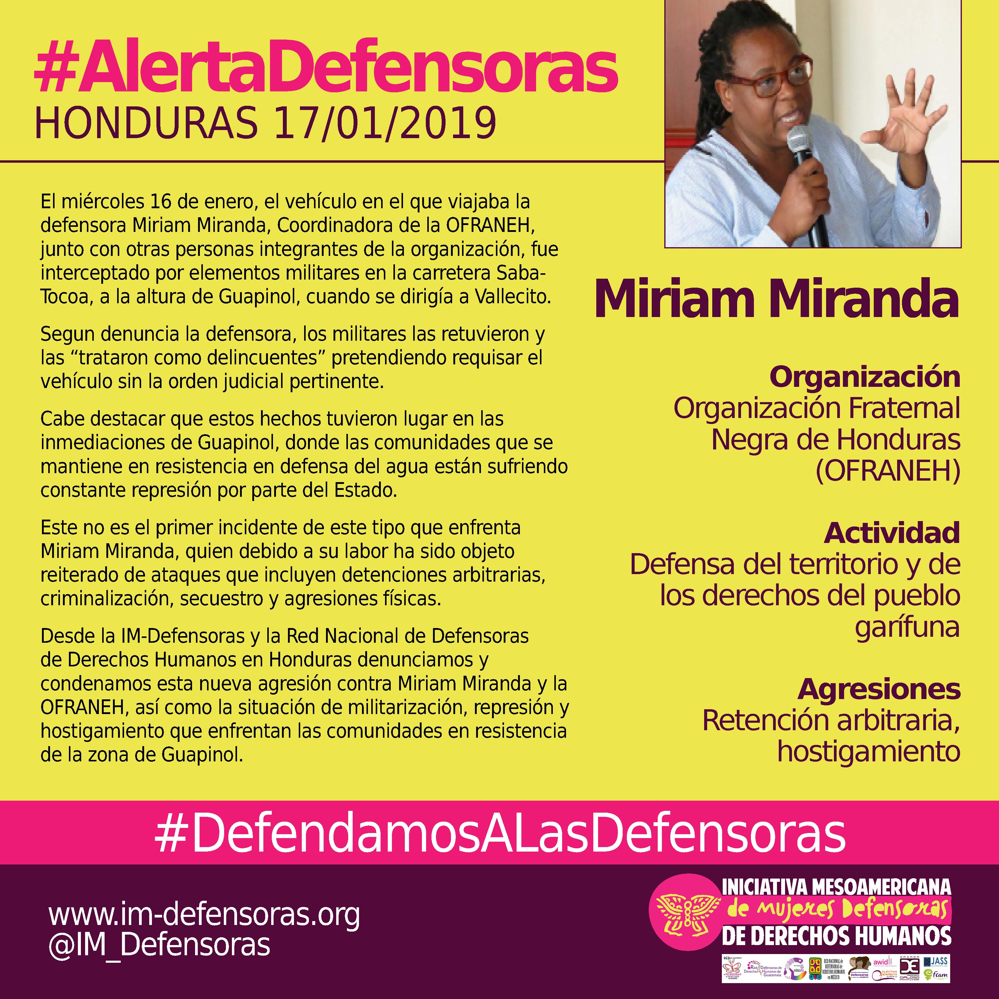 Desde la IM-Defensoras y la Red Nacional de Defensoras de Derechos Humanos en Honduras denunciamos y condenamos esta nueva agresión contra Miriam Miranda y la OFRANEH, así como la situación de militarización, represión y hostigamiento que enfrentan las comunidades en resistencia de la zona de Guapinol.