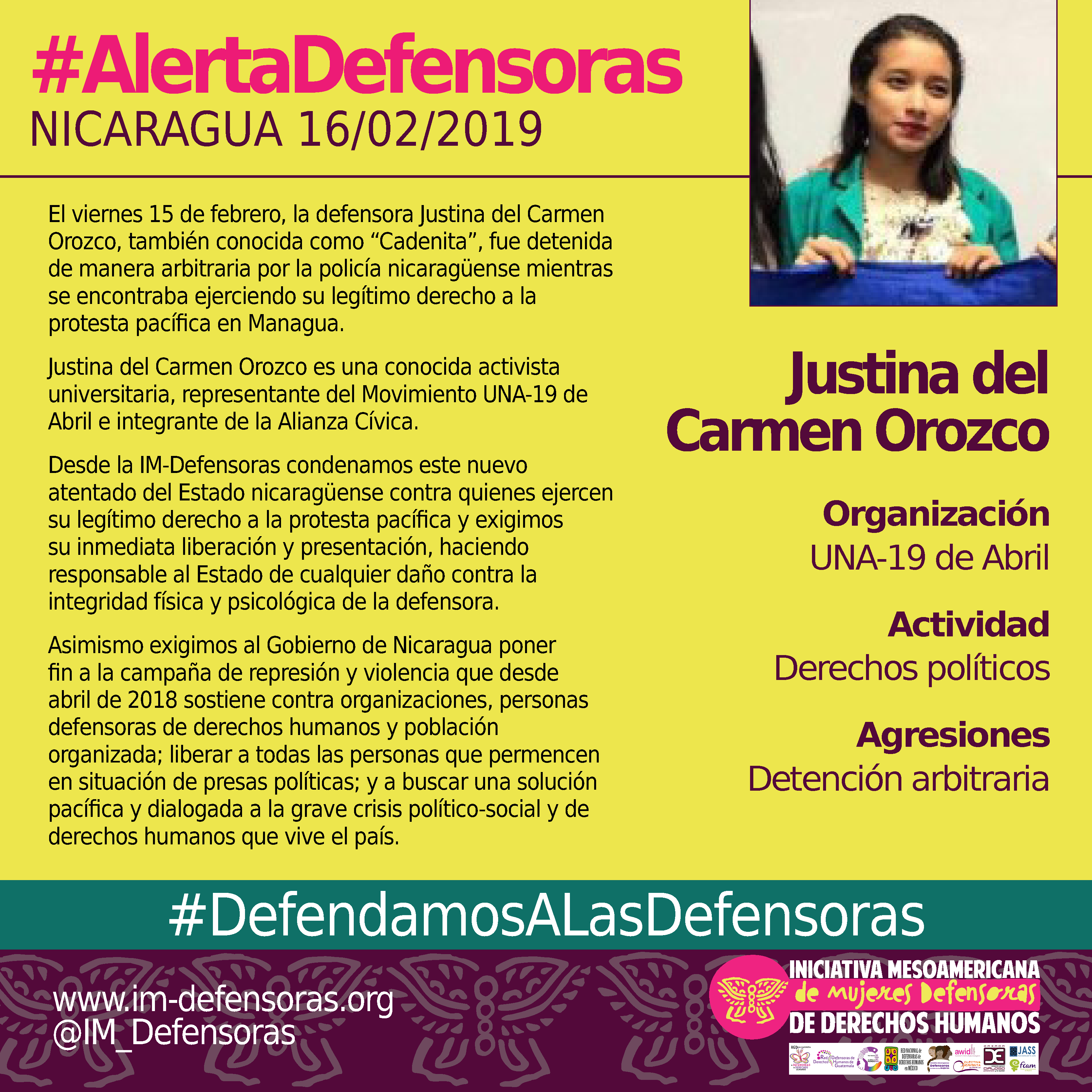 Desde la IM-Defensoras condenamos este nuevo atentado del Estado nicaragüense contra quienes ejercen su legítimo derecho a la protesta pacífica y exigimos su inmediata liberación y presentación, haciendo responsable al Estado de cualquier daño contra la integridad física y psicológica de la defensora.