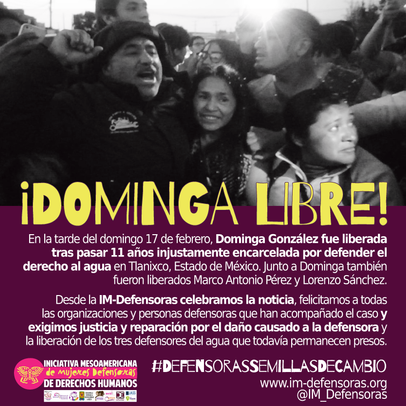 En la tarde del domingo 17 de febrero, Dominga González fue liberada tras pasar 11 años injustamente encarcelada por defender el derecho al agua en Tlanixco, Estado de México. Junto a Dominga también fueron liberados Marco Antonio Pérez y Lorenzo Sánchez.