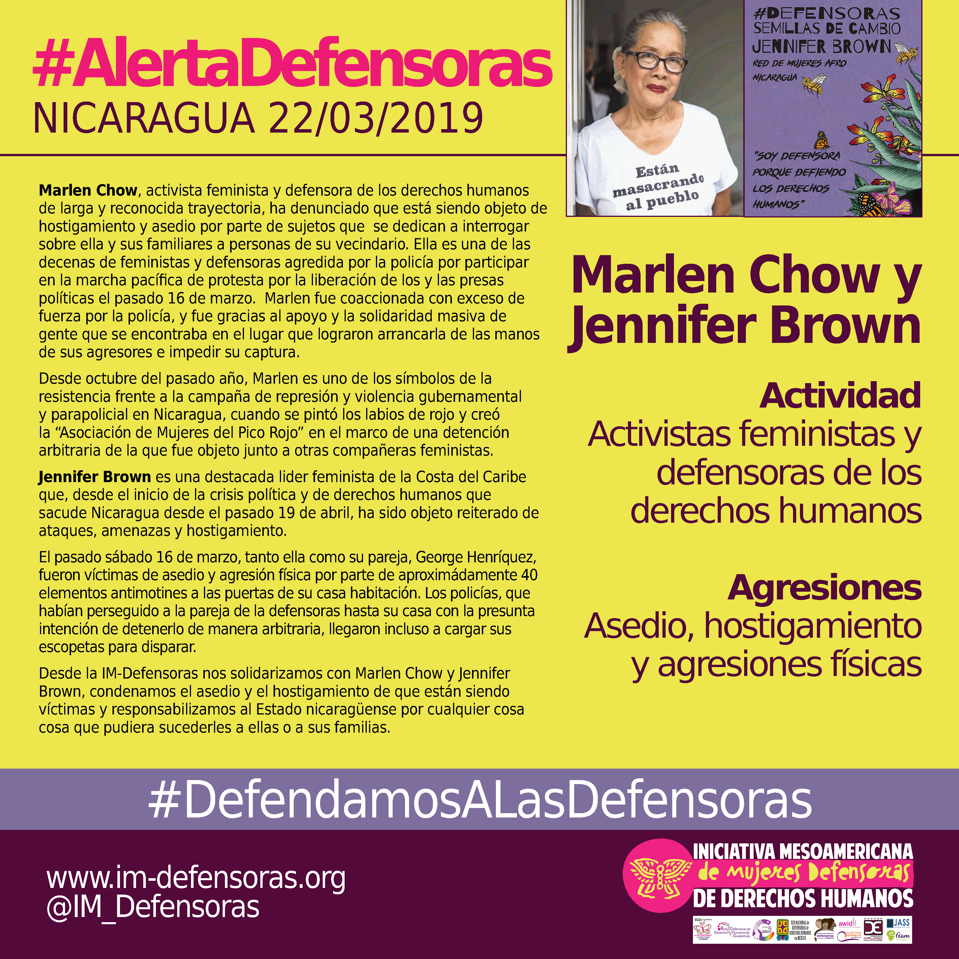 Desde la IM-Defensoras nos solidarizamos con Marlen Chow y Jennifer Brown, condenamos el asedio y el hostigamiento de que están siendo víctimas y responsabilizamos al Estado nicaragüense por cualquier cosa cosa que pudiera sucederles a ellas o a sus familias.