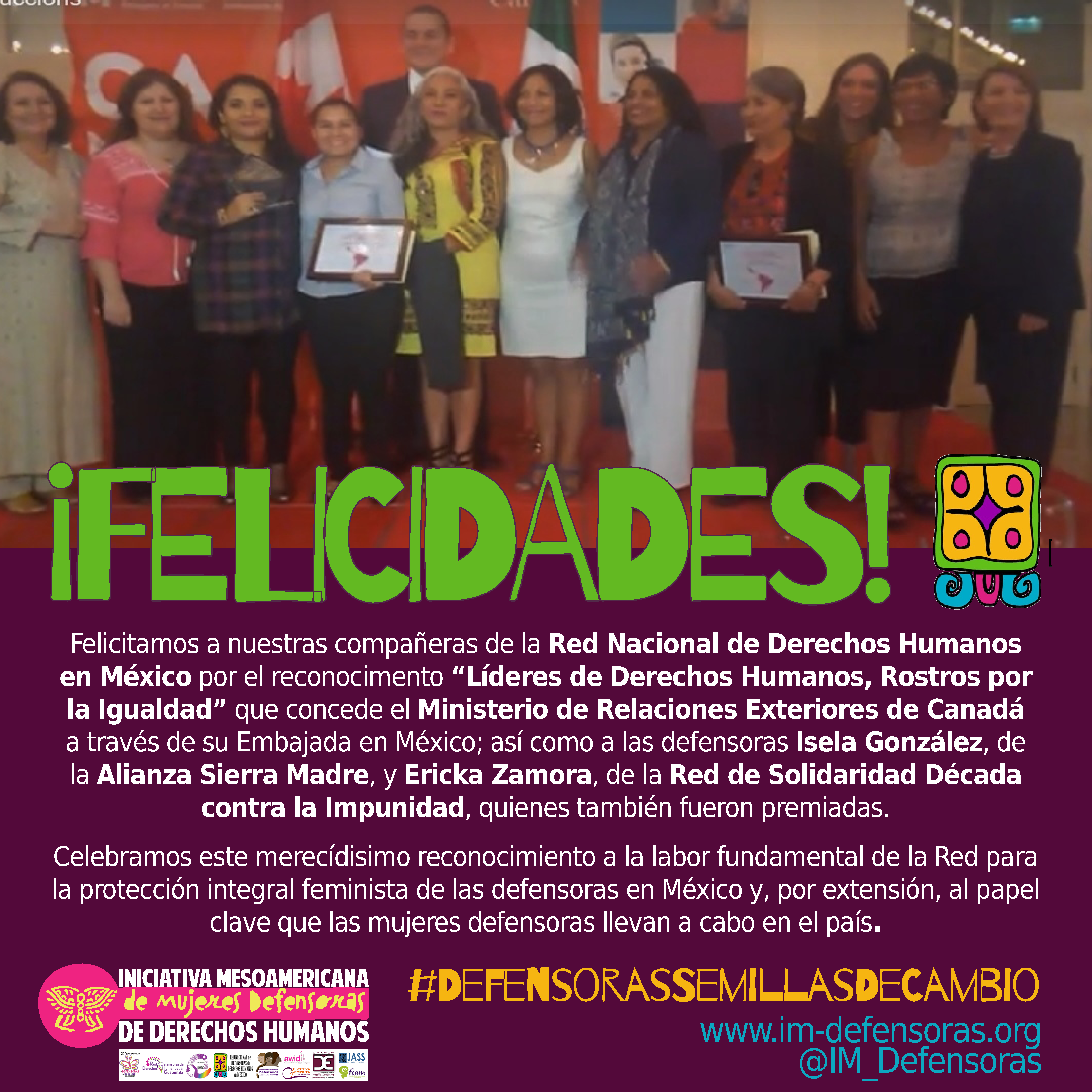Felicitamos a nuestras compañeras de la Red Nacional de Derechos Humanos en México por el reconocimento “Líderes de Derechos Humanos, Rostros por la Igualdad” que concede el Ministerio de Relaciones Exteriores de Canadá a través de su Embajada en México; así como a las defensoras Isela González, de la Alianza Sierra Madre, y Ericka Zamora, de la Red de Solidaridad Década contra la Impunidad, quienes también fueron premiadas.