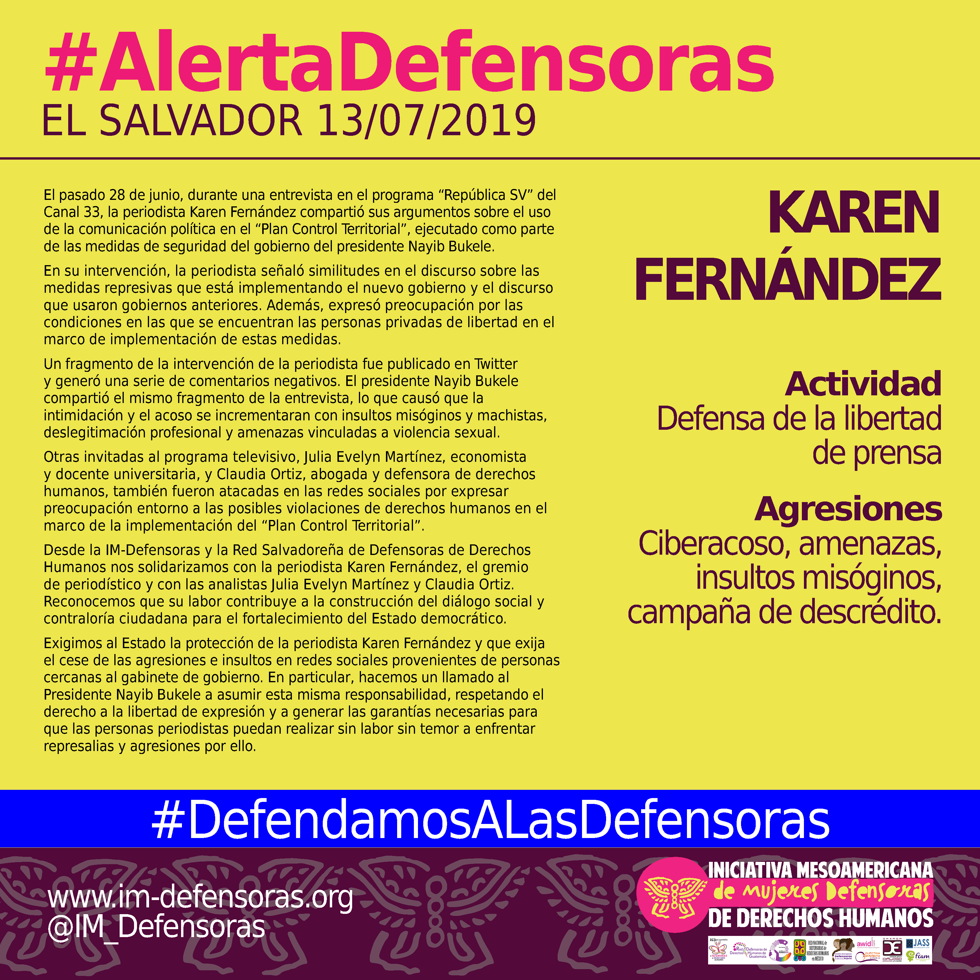 Exigimos al Estado la protección de la periodista Karen Fernández y que exija el cese de las agresiones e insultos en redes sociales provenientes de personas cercanas al gabinete de gobierno. En particular, hacemos un llamado al Presidente Nayib Bukele a asumir esta misma responsabilidad, respetando el derecho a la libertad de expresión y a generar las garantías necesarias para que las personas periodistas puedan realizar sin labor sin temor a enfrentar represalias y agresiones por ello.