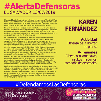Desde la IM-Defensoras y la Red Salvadoreña de Defensoras de Derechos Humanos nos solidarizamos con la periodista Karen Fernández, el gremio de periodístico y con las analistas Julia Evelyn Martínez y Claudia Ortiz. Reconocemos que su labor contribuye a la construcción del diálogo social y contraloría ciudadana para el fortalecimiento del Estado democrático.