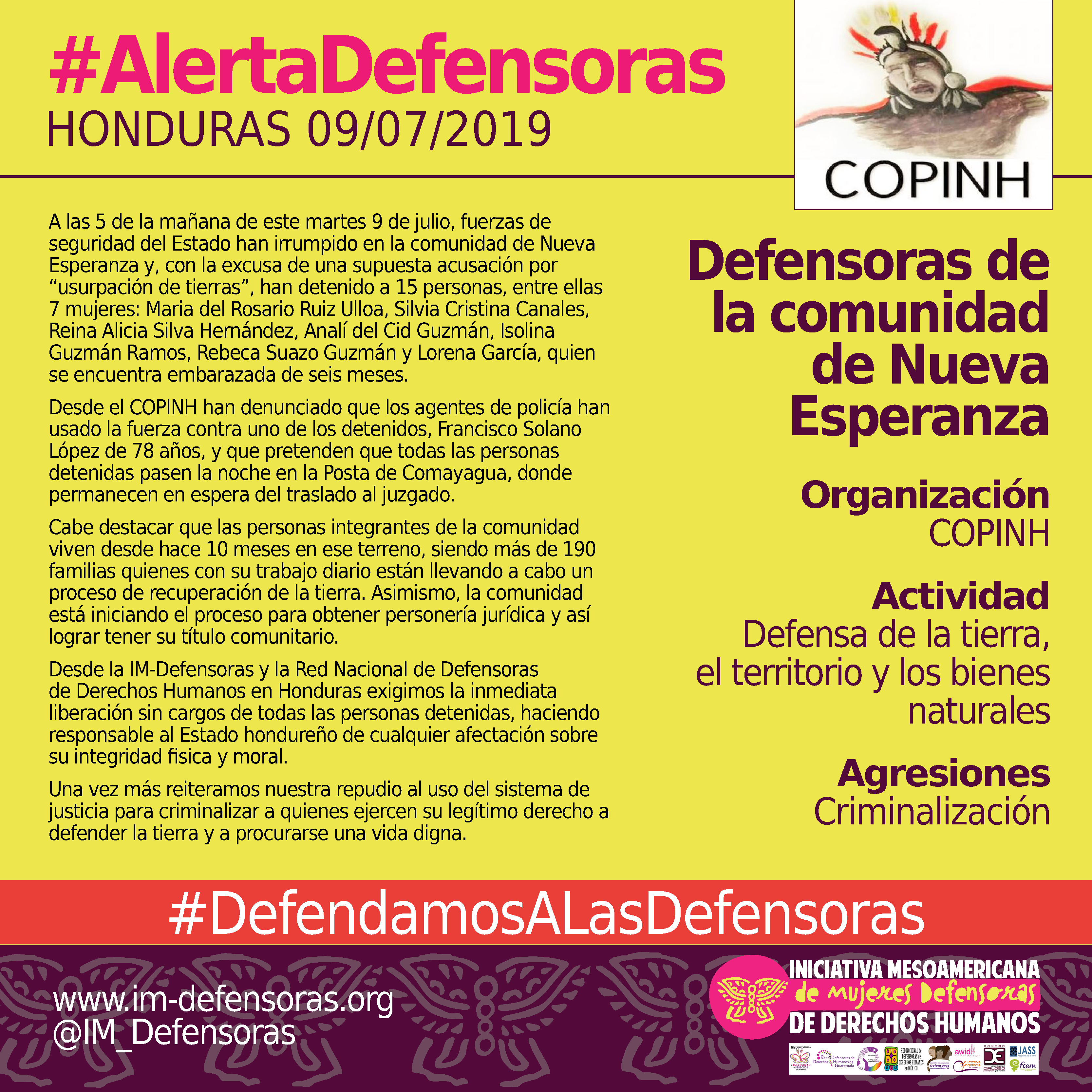 HECHOS - A las 5 de la mañana de este martes 9 de julio, fuerzas de seguridad del Estado han irrumpido en la comunidad de Nueva Esperanza y, con la excusa de una supuesta acusación por “usurpación de tierras”, han detenido a 15 personas, entre ellas 7 mujeres: Maria del Rosario Ruiz Ulloa, Silvia Cristina Canales, Reina Alicia Silva Hernández, Analí del Cid Guzmán, Isolina Guzmán Ramos, Rebeca Suazo Guzmán y Lorena García, quien se encuentra embarazada de seis meses.