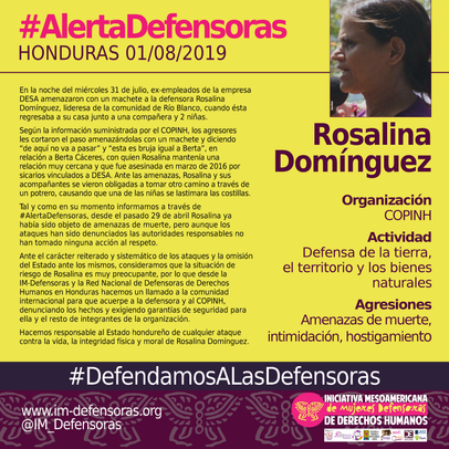 Según la información suministrada por el COPINH, los agresores les cortaron el paso amenazándolas con un machete y diciendo “de aquí no va a pasar” y “esta es bruja igual a Berta”, en relación a Berta Cáceres, con quien Rosalina mantenía una relación muy cercana y que fue asesinada en marzo de 2016 por sicarios vinculados a DESA. Ante las amenazas, Rosalina y sus acompañantes se vieron obligadas a tomar otro camino a través de un potrero, causando que una de las niñas se lastimara las costillas.