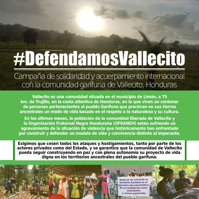 Vallecito es una comunidad situada en el municipio de Limón, a 75 kilómetros de Trujillo, en la costa atlántica de Honduras, en la que viven un centenar de personas pertenecientes al pueblo Garífuna que practican en sus tierras ancestrales un modo de vida basado en el respeto a la naturaleza y su cultura. Desde esta visión, la comunidad se opone a la explotación turística, al monocultivo de palma africana y al narcotráfico; y a través de la recuperación del cultivo ancestral del coco y de otros productos de autoconsumo evita la depredación del territorio y construye una alternativa de vida digna para decenas de familias y jóvenes. Para la defensa de su territorio, de su forma de vida y de su cultura, la comunidad, se encuentra organizada en la Organización Fraternal Negra Hondureña (OFRANEH).