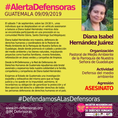 Desde la IM-Defensoras y la Red de Defensoras de Derechos Humanos de Guatemala repudiamos este brutal asesinato y expesamos toda nuestra solidaridad a la familia, compañeros y compañeras de Diana Isabel Hernández.