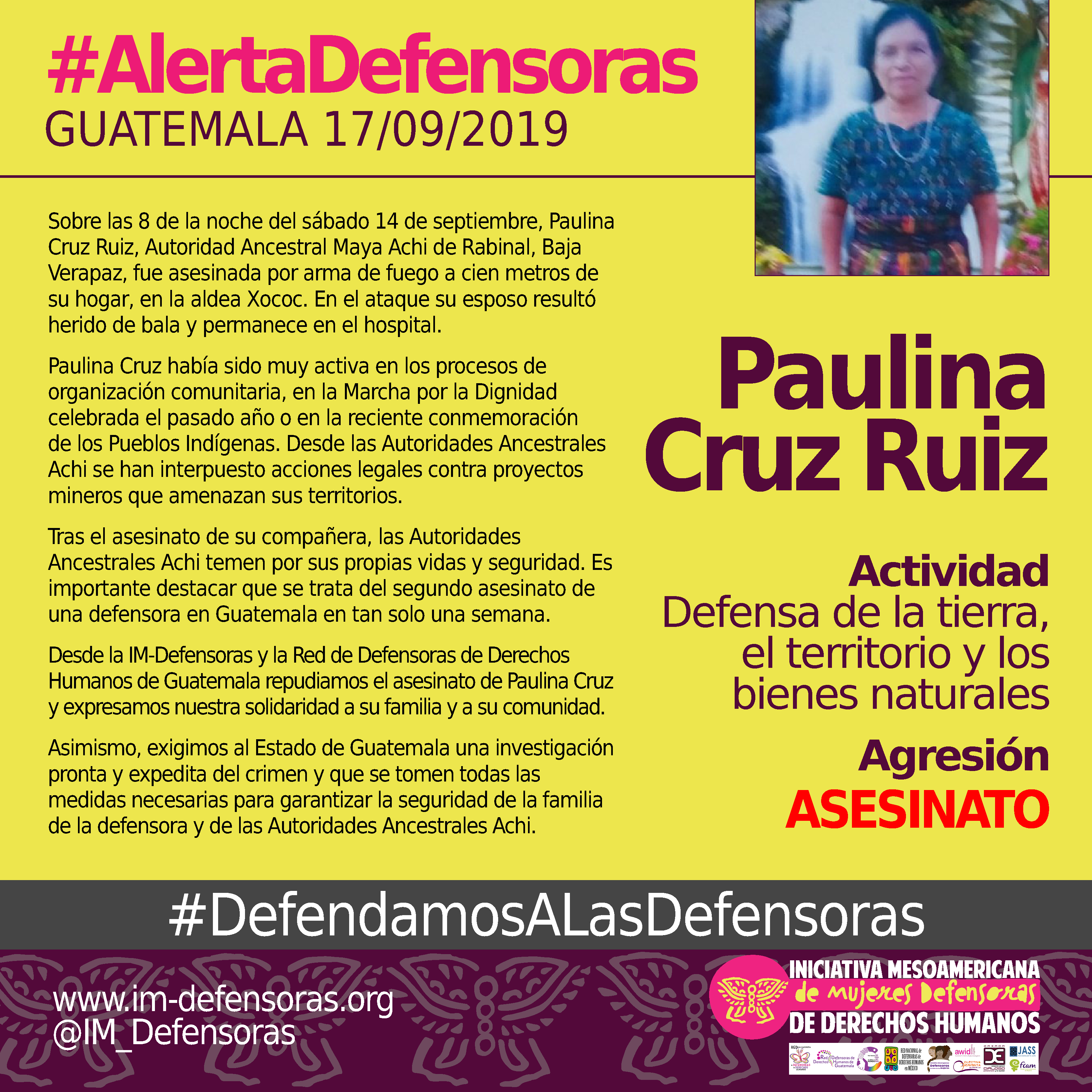 Desde la IM-Defensoras y la Red de Defensoras de Derechos Humanos de Guatemala repudiamos el asesinato de Paulina Cruz y expresamos nuestra solidaridad a su familia y a su comunidad.