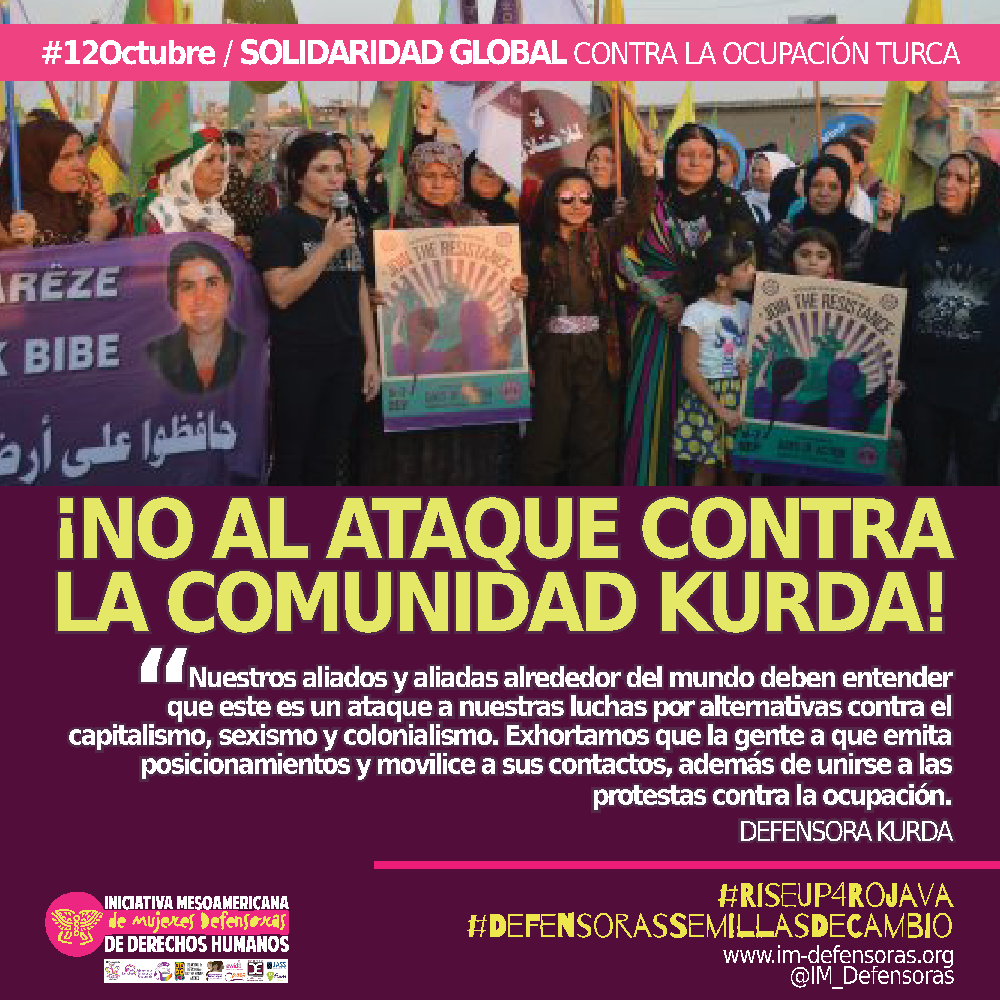 Desde la IM-Defensoras nos unimos al llamado de las defensoras kurdas para que la comunidad internacional, las organizaciones y los movimientos sociales nos posicionemos y demandemos el cese inmediato a los ataques y la ocupación turca en Siria. Unámonos a las protestas en nuestros países y exijamos un cese a la guerra, a la ocupación turca y a la limpieza étnica contra el pueblo kurdo.
