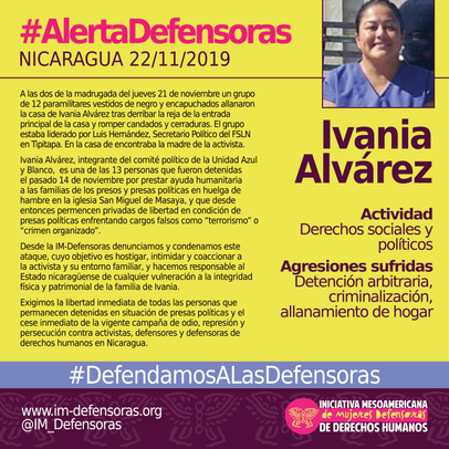 HECHOS - A las dos de la madrugada del jueves 21 de noviembre un grupo de 12 paramilitares vestidos de negro y encapuchados allanaron la casa de Ivania Alvárez tras derribar la reja de la entrada principal de la casa y romper candados y cerraduras. El grupo estaba liderado por Luis Hernández, Secretario Político del FSLN en Tipitapa. En la casa de encontraba la madre de la activista.