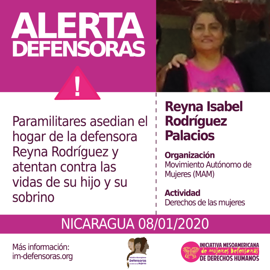Asimismo exigimos el cese del asedio y el hostigamiento contra Reyna Rodríguez (quien desde septiembre de 2018 cuenta con Medidas Cautelares otorgadas por la CIDH) y su familia, haciendo responsable al Gobierno de Nicaragua de cualquier atentado contra su integridad física, moral y patrimonial.
