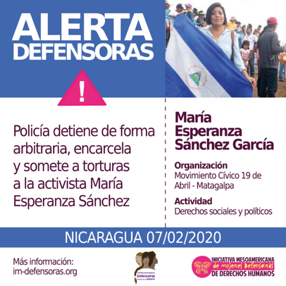 HECHOS - La noche del pasado 26 de enero, la activista María Esperanza Sánchez fue detenida de manera arbitraria por la policía. La detención tuvo lugar en una casa de seguridad a la que la defensora había acudido debido al constante asedio del que era objeto en su casa hogar, en Matagalpa. Ayer, jueves 6 de febrero, María Esperanza fue trasladada a la cárcel de mujeres conocida como “La Esperanza”, donde permanece privada de libertad.