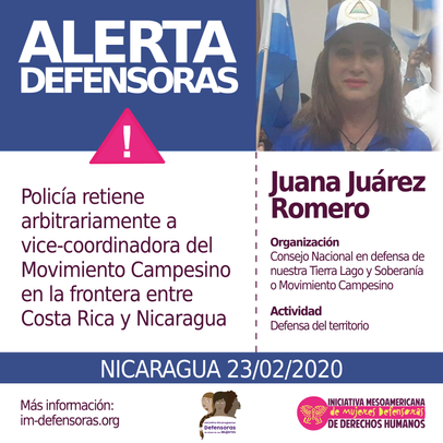 HECHOS - El sábado 22 de febrero, la policía nicaragüense retuvo de manera arbitraria por más de dos horas a la defensora Juana Juárez, en el paso fronterizo entre Costa Rica y Nicaragua conocido como Peñas Blancas.
