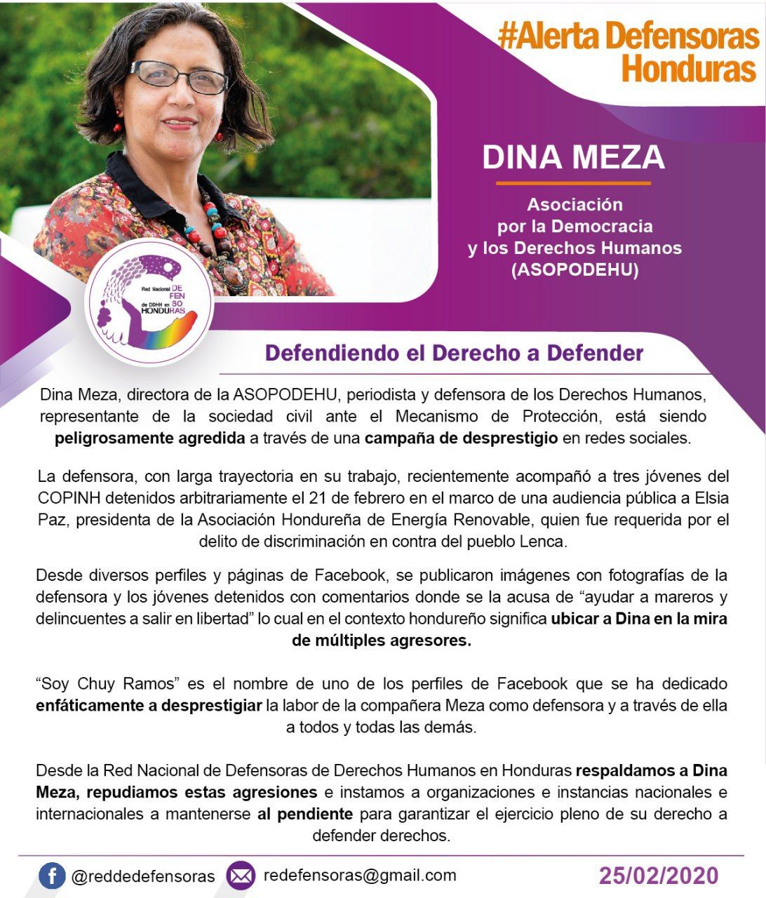 Desde la Red Nacional de Defensoras de Derechos Humanos en Honduras respaldamos a Dina Meza, repudiamos estas agresiones e instamos a organizaciones e instancias nacionales e internacionales a mantenerse al pendiente para garantizar el ejercicio pleno de su derecho a defender derechos.