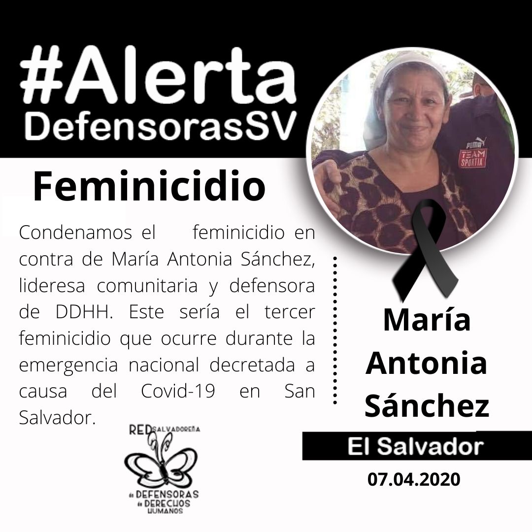 Red Salvadoreña de Defensoras de Derechos Humanos - El pasado martes 7 de abril fue asesinada María Antonia Sánchez, lideresa comunitaria en el Cantón Casa de Piedra, municipio de San Marcos. Este es el tercer feminicio que ocurre durante el decreto de emergencia nacional a causa del Covid-19.