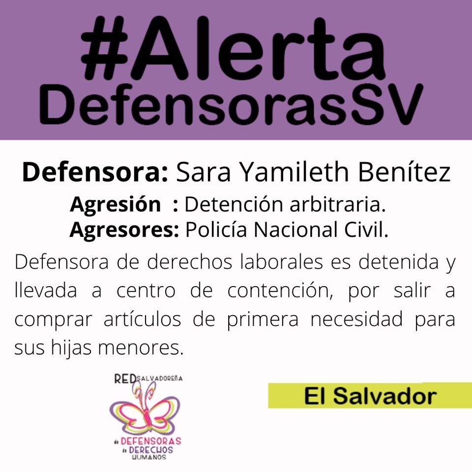 El 11 de marzo, Sara Benítez salió de su hogar en horas de la mañana para reabastecerse de productos que vende informalmente desde su casa y comprar alimentos. En alrededores del parque infantil, por la 7° av. Norte, la Policía Nacional Civil la detuvo y le dijeron que les acompañara, que sólo tomarían una hora de su tiempo para realizarle una prueba de COVID19 y que luego se comprometían a dejarla hasta su casa. Los agentes la trasladaron al polideportivo de Merliot, estando ahí, le notificaron que no estaría sólo una hora ahí, sino 30 días de cuarentena obligatoria.