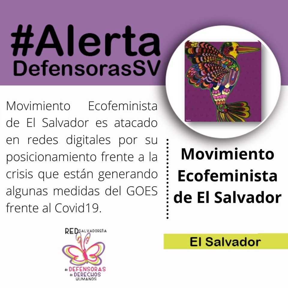El 31 de marzo, el Movimiento de mujeres ecofeministas de El Salvador fue atacado en su cuenta de Facebook, por diversos usuarios a través de comentarios y mensajes en forma de hostigamiento, insultos misóginos y expresiones de odio.