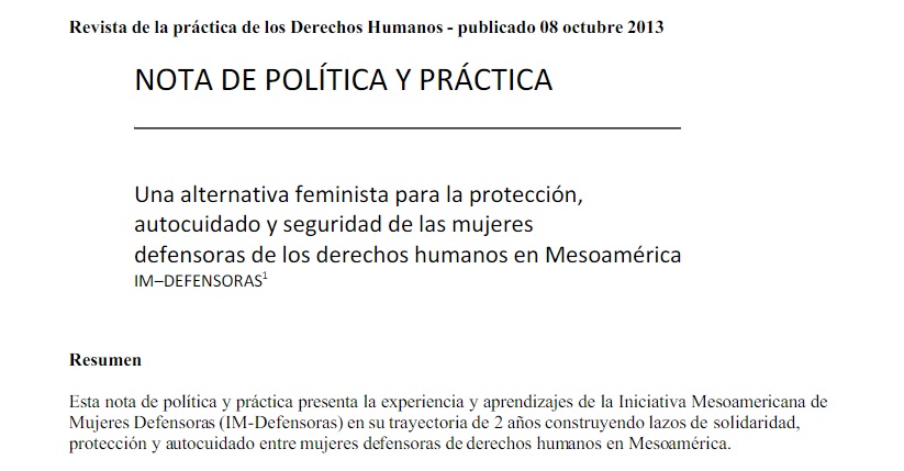 - Revista de la Práctica de los Derechos Humanos - Universidad de York: Una alternativa feminista para la protección, autocuidado y seguridad de las mujeres defensoras de los derechos humanos en Mesoamérica (IM-Defensoras), IM-Defensoras