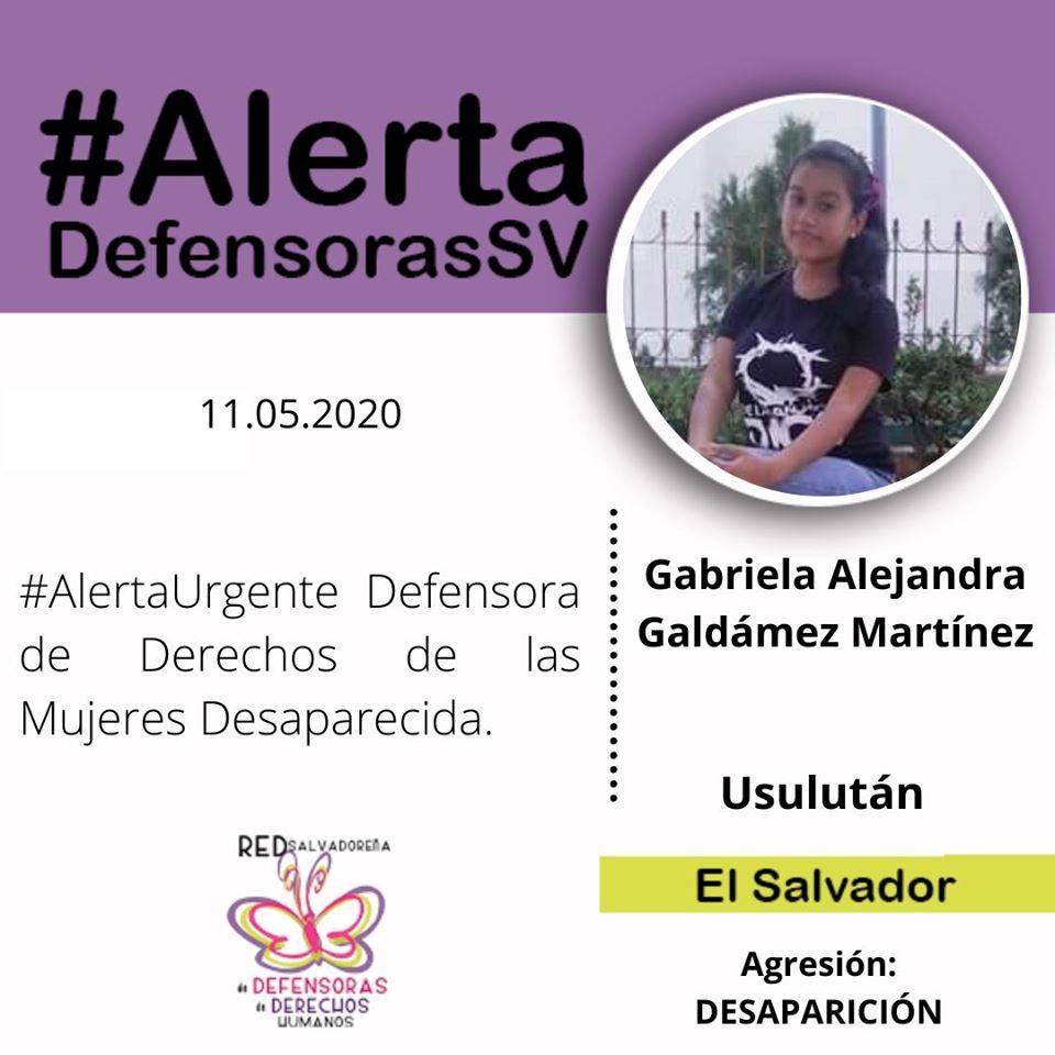Red Salvadoreña de Defensoras de Derechos Humanos - El domingo 10 de mayo, la defensora Gabriela Alejandra Galdamez Martínez, salió de su casa en la Colonia Santa Clara, en Usulután, a las 9:30AM para hacer compras de alimentos. Su familia ha intentado contactarla, pero no hay respuesta.