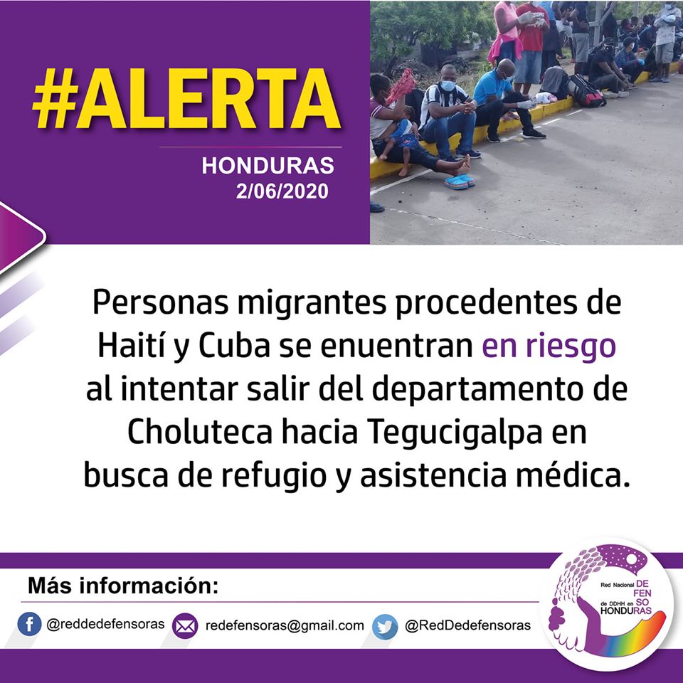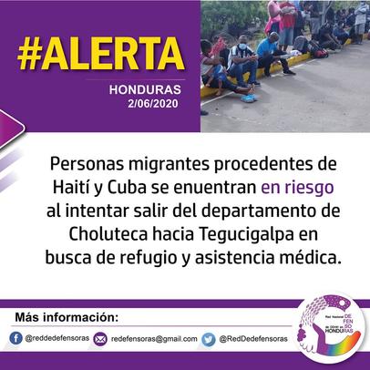 Red Nacional de Defensoras de Derechos Humanos en Honduras - Cansadas y cansados de la política racista de quienes gestionan la crisis sanitaria actual que les ha dejado en la indefensión en un momento tan grave, unas 100 personas migrantes de origen haitiano y cubano, entre ellas niñas, niños y mujeres embarazadas, se movilizan a pie, hacia la salida del departamento de Choluteca, con el fin de llegar a Tegucigalpa para encontrar refugio digno y atención médica.