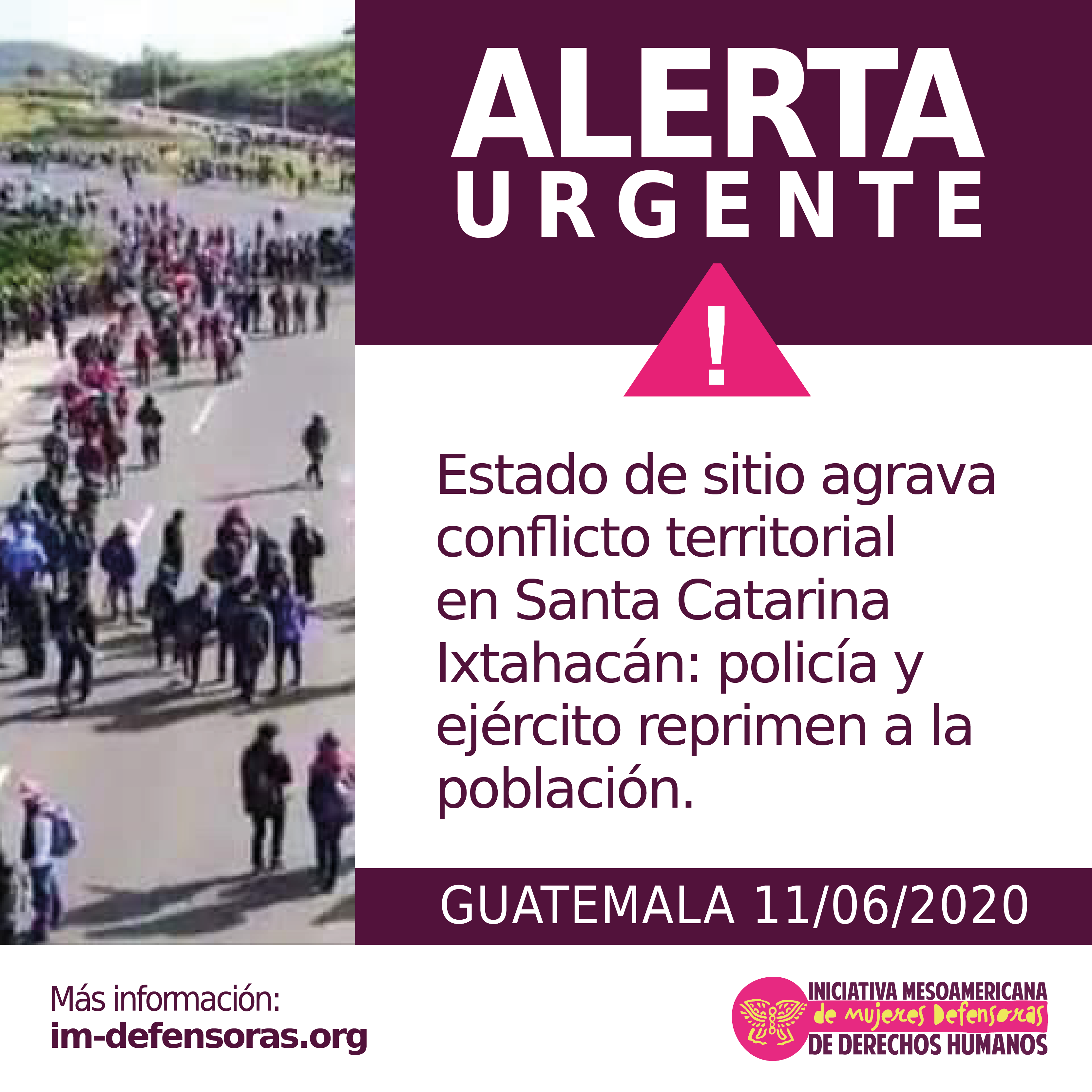 El conflicto territorial en la zona ha venido escalando desde el mes de marzo y se ha agravado con el Estado de sitio, ya que el ejército y la PNC están apoyando a los pobladores de Nahuala, e incluso se han llevado a cabo detenciones arbitrarias de personas defensoras de los derechos humanos de Santa Catarina, como es el caso de Manuela Alejandra Pop Tuy y su esposo; y la de Ana Guarchaj Tun, a la que criminalizan por un supuesto delito de "encubrimiento" y continúa privada de libertad tras suspenderse por dos veces su audiencia el 6 y 11 de junio debido, según las autoridades, a que no puede realizarse ningún tipo de traslado por el contexto de la pandemia COVID-19.