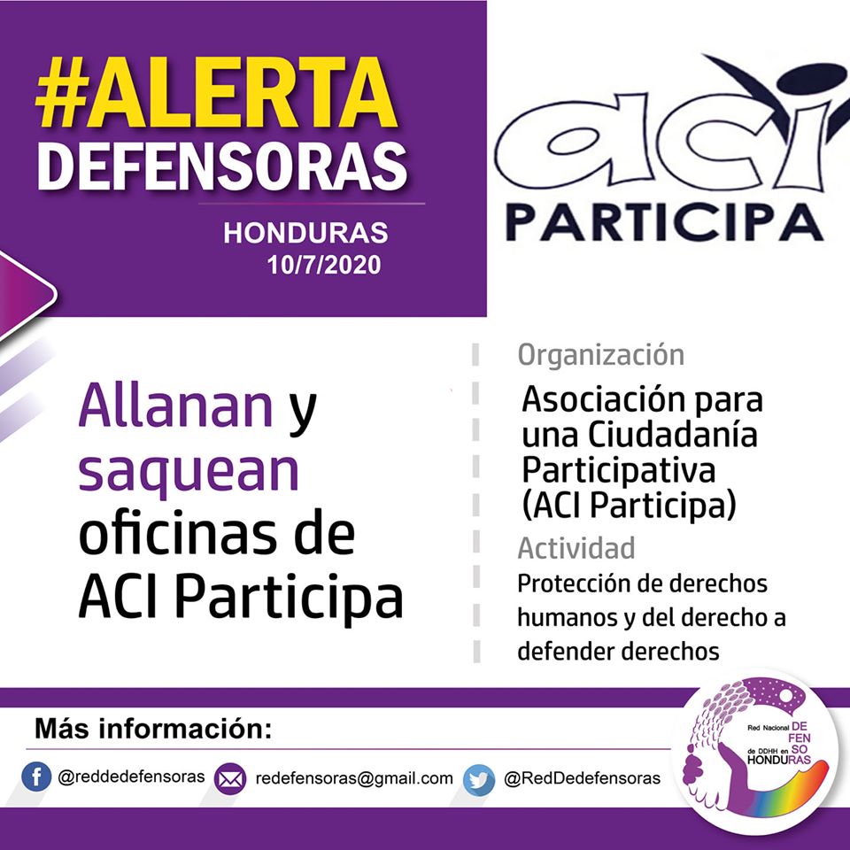 Desde la Red Nacional de Defensoras de Derechos Humanos en Honduras, nos solidarizamos con ACI Participa y condenamos estos hechos que visibilizan la vulnerabilidad en la que, en tiempos de pandemia, nos encontramos las organizaciones que tenemos como función principal la protección de los derechos humanos.