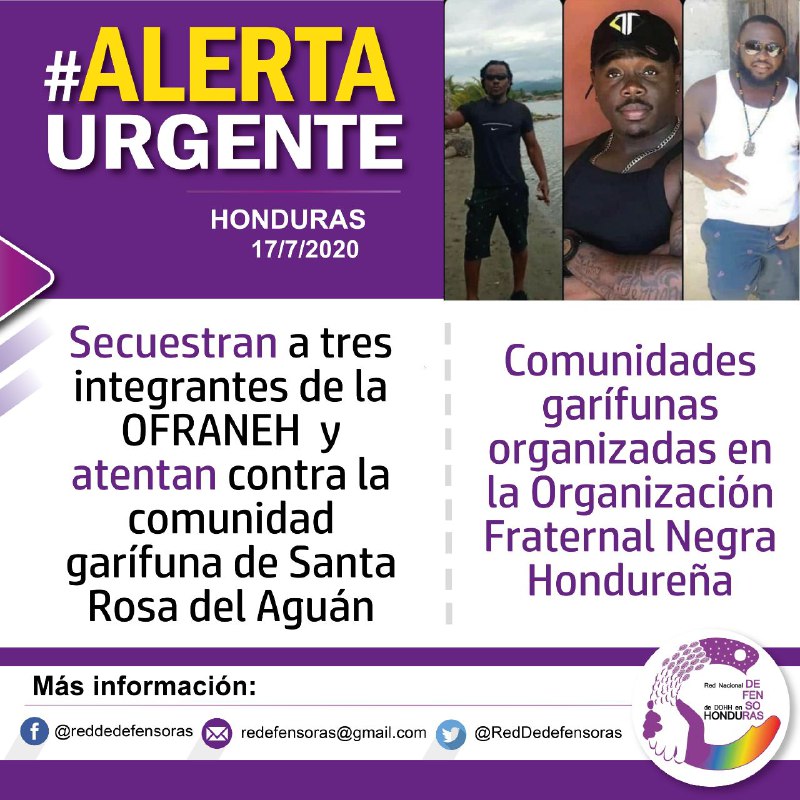 Los tres jóvenes desaparecidos son integrantes activos de la Organización Fraternal Negra Hondureña (OFRANEH), organización que históricamente ha sido amenazada y perseguida por grupos de poder amparados por la complicidad del Estado de Honduras que ha perpetuado la impunidad en contra de las comunidades garífunas.