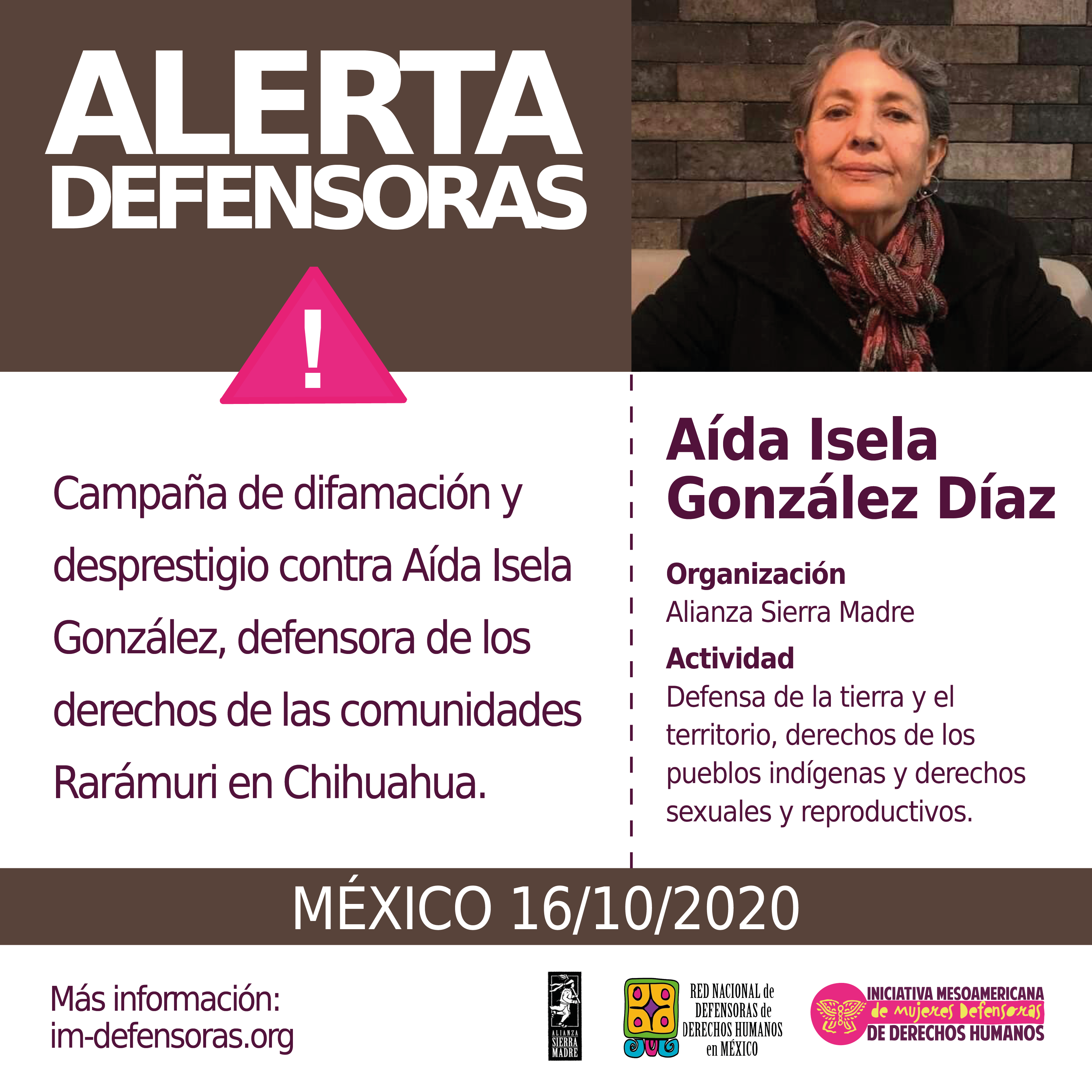 Desde la IM-Defensoras, la Red Nacional de Defensoras de Derechos Humanos en México y Alianza Sierra Madre exigimos el cese a los actos de difamación en contra de la defensora de derechos humanos Aída Isela González, así como garantías de seguridad para ella y para todas las personas que integran la comunidad Rarámuri de de Choréachi.