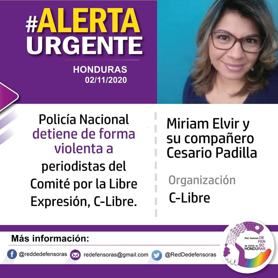 Red Nacional de Defensoras de Derechos Humanos en Honduras - El lunes 2 de noviembre de 2020, en horas de la tarde, la Policia Nacional ha detenido arbitraria y violentamente a la periodista del Comité por la Libre Expresión, Miriam Elvir y su compañero Cesario Padilla, mientras ejercían su labor periodística en Tegucigalpa.