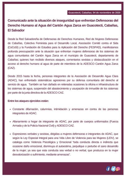 Desde la Red Salvadoreña de Defensoras de Derechos Humanos, Red de Mujeres Defensoras de Cabañas, Colectiva Feminista para el Desarrollo Local, Asociación Comité contra el Sida (CoCoSI) y la Fundación de Estudios para la Aplicación del Derecho (FESPAD), manifestamos profunda preocupación ante la situación que enfrentan mujeres defensoras de los sistemas de agua comunitarios del Cantón Agua Zarca en el municipio de Guacotecti, departamento de Cabañas; quienes han recibido diversos ataques, comentarios sexistas y obstaculización en el acceso al derecho humano al agua de parte de miembros de la ADESCO Cantón Agua Zarca (CAZ).
