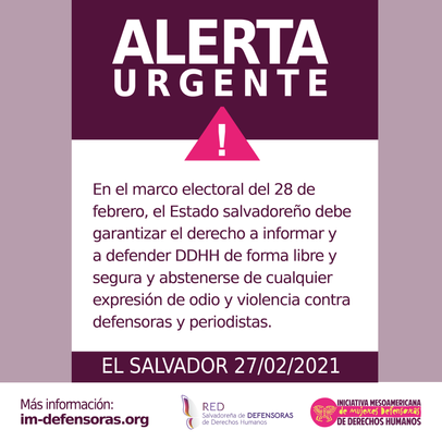 Desde la Red Salvadoreña de Defensoras de Derechos Humanos y la IM-Defensoras nos preocupa que, en el contexto descrito, el proceso electoral de este domingo 28 de febrero pueda desarrollarse con plenas garantías de participación política, libertad de expresión, derecho a la información y derecho a defender derechos y bajo las debidas condiciones de seguridad para las mujeres candidatas de los distintos partidos, periodistas y defensoras de derechos humanos que desarrollarán su labor de monitoreo y vigilancia del proceso. Por este motivo, exigimos al gobierno salvadoreño que cumpla con su deber de garantizar unas elecciones libres, transparentes y seguras; expresando nuestra intención de mantenernos vigilantes y dispuestas a documentar y denunciar cualquier irregularidad y vulneración de los derechos humanos de nuestras compañeras salvadoreñas.