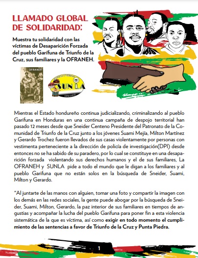Mientras el Estado hondureño continua judicializando, criminalizando al pueblo Garifuna en Honduras en una continua campaña de despojo territorial han pasado 12 meses desde que Sneider Centeno Presidente del Patronato de la Comunidad de Triunfo de la Cruz junto a los jóvenes Suami Mejía, Milton Martínez y Gerardo Trochez fueron llevados de sus casas violentamente por personas con vestimenta perteneciente a la dirección de policía de investigación(DPI) desde entonces no se ha sabido de su paradero, por lo cual se constituye en una desaparición forzada violentando sus derechos humanos y el de sus familiares, la OFRANEH y SUNLA pide a todo el mundo que le digan a los familiares y al pueblo Garifuna que no están solos en la búsqueda de Sneider, Suami, Milton y Gerardo.