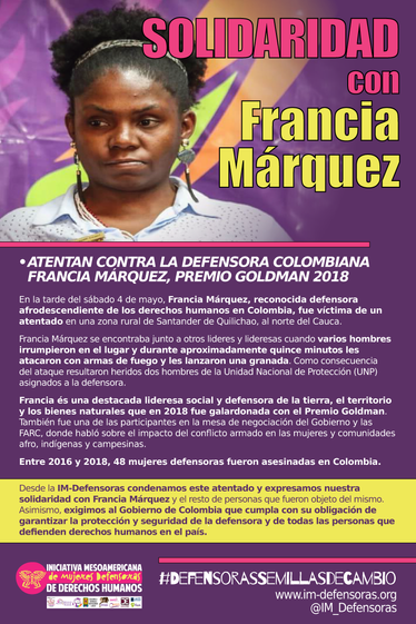 ATENTAN CONTRA LA DEFENSORA COLOMBIANA FRANCIA MÁRQUEZ, PREMIO GOLDMAN 2018