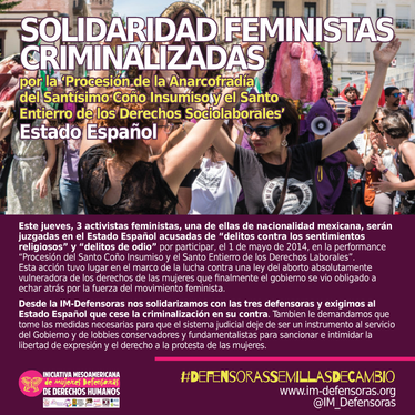 SOLIDARIDAD FEMINISTAS CRIMINALIZADAS por la ‘Procesión de la Anarcofradía del Santísimo Coño Insumiso y el Santo Entierro de los Derechos Sociolaborales’, Estado Español