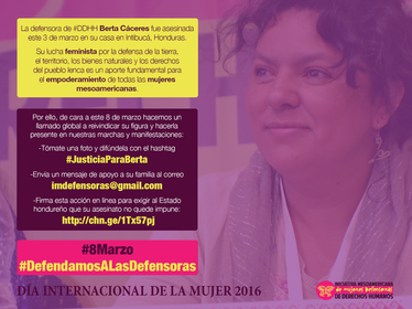 CONVOCATORIA / La Red Nacional de Defensoras de DDHH en Honduras convoca a movilizarnos ante las embajadas de Honduras este 2 de marzo para exigir #JusticiaParaBerta