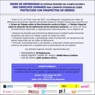 NOTICIAS / REDES DE DEFENSORAS DE DIVERSAS REGIONES DEL PLANETA ACUDEN A ONU DERECHOS HUMANOS PARA COMPARTIR EXPERIENCIAS SOBRE PROTECCIÓN CON PERSPECTIVA DE GÉNERO