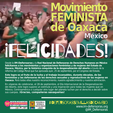 Felicitamos al movimiento feminista oaxaqueño por el logro histórico de la despenalización del aborto en el Estado de Oaxaca, México