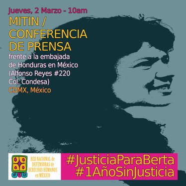CONVOCATORIA / #JusticiaParaBerta Mitin-Conferencia de prensa frente a Embajada de Honduras en México
