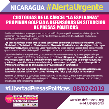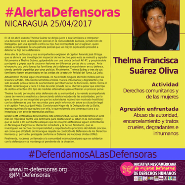 26 de mayo de 2016 - Desde hace 18 años Arelys del Carmen Cano Meza es defensora de los derechos humanos de las personas que conviven con el VIH. Actualmente es la representante para América Latina de la Comunidad Internacional de Mujeres con VIH (ICW - Latina).  En la madrugada del domingo 20 de marzo, el vehículo en el cual se transportaba Arelys con sus familiares fue detenido en un control de tránsito en Manuagua. Los policias ordenaron que todas las personas se bajaran del mismo y señalaron que lo enviarían al depósito municipal por supuesto aliento alcohólico del conductor.  Arelys reclamó a los policias que estaban haciendo un procedimiento arbitrario,  ya que primero tienen que hacer la prueba del alcoholimetro que lo confirme, estos la ofendieron y, seguidamente, en respuesta a la exigencia de la defensora de que se respetasen sus derechos, procedieron a detenerla arbitrariamente. Ante las quejas de la defensora por el abuso policial, un grupo de policías se abalanzó contra ella, la tiraron al suelo, la agredieron físicamente y la esposaron arrastándola hacia la patrulla policial, donde además de recbir una bufetada en la cara siguió siendo objeto de trato denigrante y burlas. A continuación la trasladaron a la Delegación de Policía. La agresión fue grabada por familiares y otras personas presentes, quienes posteriormente fueron obligadas a borrar las grabaciones y amenazados de ser también detenidos. Durante la detención, que duró 2 días, no le permitieron informar a sus familiares y la continuaron sometiendo a trato cruel, degradante e inhumano. Entre otros abusos le privaron de sus medicamentos, querían someterla  a desnudare para hacer sentadillas y luego ser objeto de un registro vaginal, al igual que el resto de mujeres detenidas. En la tarde del lunes 21 fue liberada tras una campaña de denuncia en Redes sociales y diversos medios de comunicación. Dos semanas después tuvo noticias de que el Ministerio Publico la había acusado por el delito de Obstrucción de funciones y en la audiencia inicial se admitió la misma y se programó el juicio para el próximo 27 de mayo. Cabe señalar que la acusación responsabiliza a Arelys de haber agredidos a los oficiales de policía y amenazarlos de contagio del VIH.   Desde la IM-Defensoras condenamos estos abusos y el trato degradante, cruel e inhumano de que ha sido víctima la defensora y exigimos a las autoridades nicaragüenses que garanticen su seguridad y su derecho a un proceso judicial apegado a ley, poniendo fin a su criminalización y depurando responsabildades para que hechos como los descritos no se vuelvan a repetir.