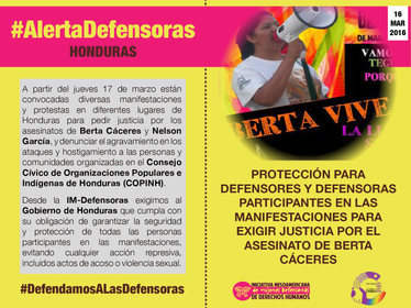 #AlertaDefensoras HONDURAS / PROTECCIÓN PARA DEFENSORES Y DEFENSORAS PARTICIPANTES EN LAS MANIFESTACIONES PARA EXIGIR JUSTICIA POR EL ASESINATO DE BERTA CÁCERES
