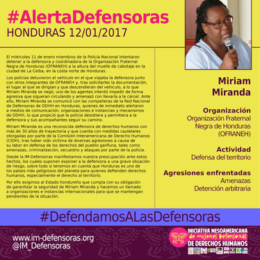 #AlertaDefensoras HONDURAS / Detención arbitraria, uso excesivo de la fuerza y criminalización a Madeline Martina David Fernández, integrante de OFRANEH