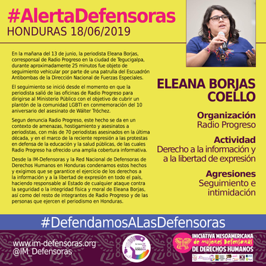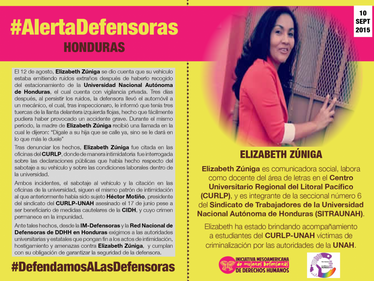 #AlertaDefensoras HONDURAS / Intimidación, hostigamiento y amenazas contra ELIZABETH ZÚNIGA