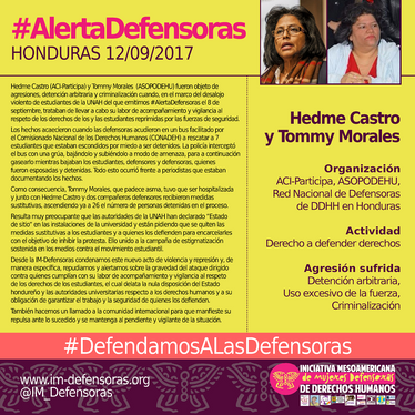 #AlertaDefensoras HONDURAS / Detención arbitraria y uso excesivo de la fuerza contra las defensoras Karla Lara y Sandra Sánchez