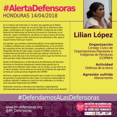 Ana Mirian Romero es una destacada defensora de los derechos territoriales de las comunidades indígenas integrante del Movimiento Indígena Lenca de La Paz Honduras - MILPAH y del Consejo Indígena de San Isidro Labrador. Tras haber sido objeto de diversos ataques, desde noviembre de 2015 la defensora y su familia gozan de medidas cautelares otorgadas por la CIDH. Ana Mirian es una de las finalistas para el Premio Anual 2016 de Front Line Defenders para Defensores/as de Derechos Humanos en Riesgo. Aproximadamente a las 4 pm del pasado 9 de mayo, cuatro hombres de la comunidad de Potrero entraron armados con machetes y una pistola a la casa de Ana Mirian Romero, en el municipio de Santa Elena, departamento de La Paz. La defensora se encontraba con sus hijas e hijo, los cuales fueron todos amenazados e intimidados por los invasores. Dos de los hombres fueron identificados por la defensora, quien indicó que los mismos individuos ya la habían amenazado anteriormente. La intimidación contra Ana Mirian Romero se dio tras la visita de una periodista de la BBC Radio y un periodista hondureño, quienes la habían estado visitando para realizar un documental radial sobre la historia de la defensora. La defensora ya había sido anteriormente objeto de actos de intimidación y ataques. El 29 de enero de 2016 sufrió un ataque incendiario en su domicilio. El 2 de noviembre de 2015 dispararon más de quince tiros fuera de su domicilio. El 22 de octubre de 2015, 30 policías ingresaron a su casa usando la fuerza y sin presentar orden formal para ello. Durante el incidente los agentes golpearon a la defensora, que tenía 24 semanas de embarazo, y tuvo que ser trasladada en estado grave al hospital. Desde la IM-Defensoras condenamos enérgicamente este ataque y exigimos se identifique y procese a los responsables. También exigimos que el Estado hondureño cumpla con su obligación de garantizar la seguridad de Ana Mirian Romero y su familia, así como del resto de integrantes del MILPAH y del Consejo Indígena de San Isidro Labrador.