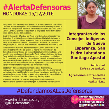 #AlertaDefensoras HONDURAS / Amenazas e intimidación contra Ana Mirian Romero, defensora del territorio integrante del MILPAH y del Consejo Indígena de San Isidro Labrador
